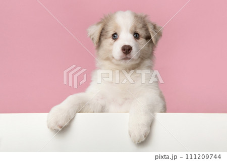 Portrait of cute australian shepherd puppy looking at the camera on a pink background
