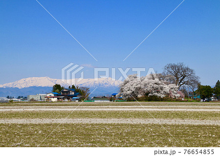 神指城跡の桜と飯豊山(福島県・会津若松市)