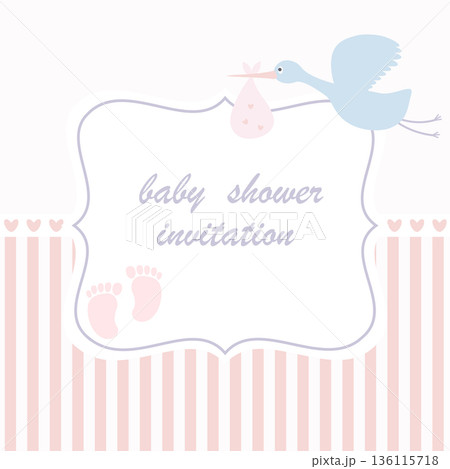 Baby shower congratulations printable card. Cartoon stork bring cute newborn baby. Flying bird and child, boy or girl party, nowaday vector banner