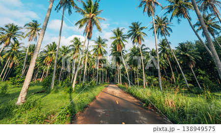 Beautiful scenic empty road passing through a tranquil coconut palm tree plantation under a clear blue sky in summer.