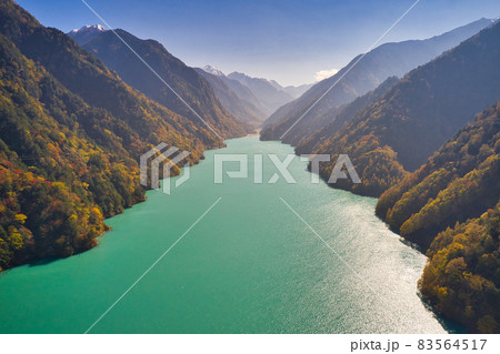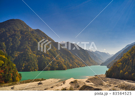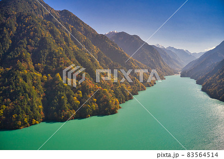 紅葉に包まれた高瀬ダムの美しいエメラルドグリーンの湖面 長野県大町市(ドローンによる空撮)