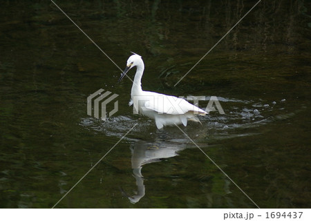 池で小エビを捕らえて食べる1羽のコサギ(シラサギ)