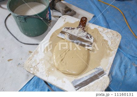 wall repair tools. putty knives , plaster bucket, gloves on kitchen countertop. renovation work