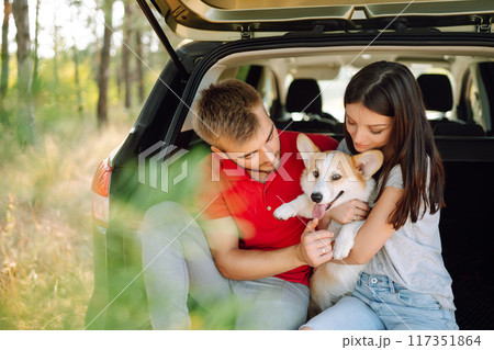 Portrait of caring, loving couple with their dog in back seat of car while traveling. Pet and human.
