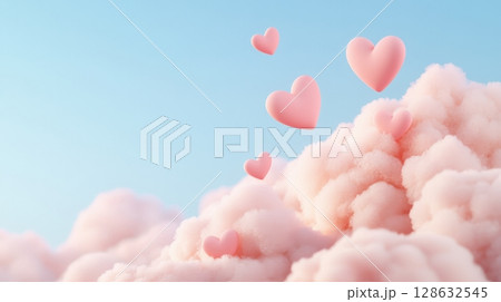 Dreamy Pink Hearts Floating in Fluffy Pastel Clouds Against Soft Blue Sky