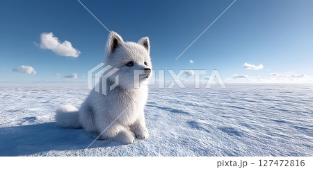 A cute, fluffy white fox sitting gracefully on a snowy landscape. Bright blue sky enhances the serene atmosphere, capturing the essence of winter and wild beauty in nature.