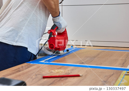 repairman using handheld electric jigsaw and cutting hole for the sink in the kitchen countertops, Woodworking and carpentry concept