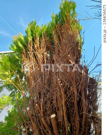 剪定したコノテガシワ (蒸れて枯れた内側)