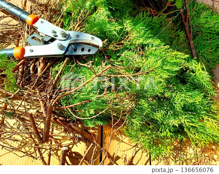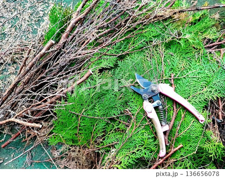 剪定したコノテガシワ 枝と葉