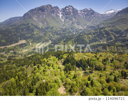 しろ池からの海谷山塊(駒ケ岳・鬼ケ面山・鋸岳)の雄大な眺め 新潟県糸魚川市(ドローンによる空撮)