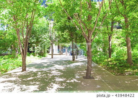 オフィス街の高層ビルと新緑