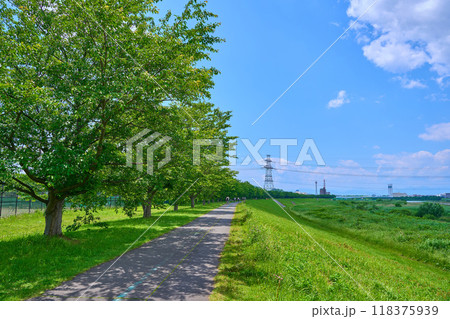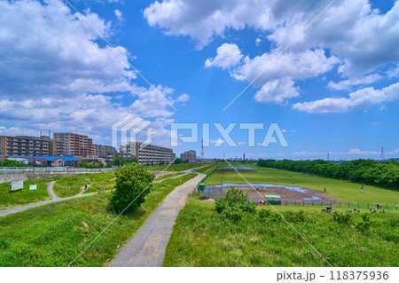 新緑の東京都稲城市東長沼の稲城北緑地公園付近の多摩川遊歩道から西側の是政橋方面を見る
