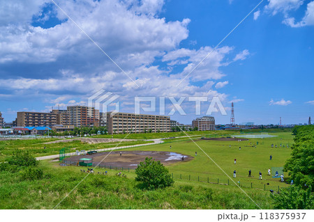 東京都府中市是政の是政橋から是政野球場やマンション群を見る