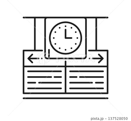 Public transport schedule, railway line icon or symbol. Train station platform schedule display, railroad industry outline sign, railway transportation vector pictogram with platform direction arrows