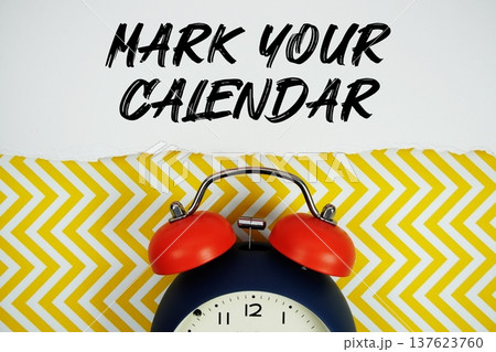 Mark Your Calendar text written on paper rip with alarm clock flat lay on yellow chevron background
