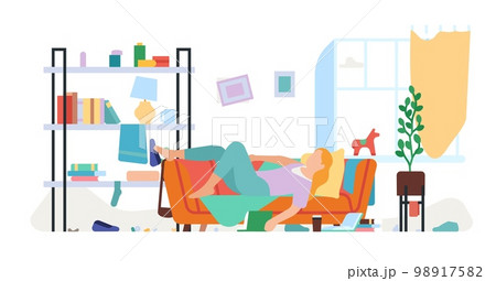 Lazy woman in messy room. Home clutter. Trash and scattered things. Female lying on couch. Depression and procrastination. Young tired passive person. Dirty apartment. Vector concept