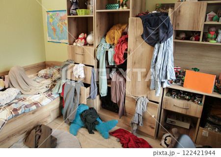 Scattered Things in Wardrobe, Disorder in Clothes. Childrens room is littered with clutter