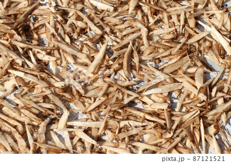 天日干しで乾燥した笹がきゴボウを焦がさぬようフライパンでから煎り完成。、手作りゴボウ茶の作り方その三