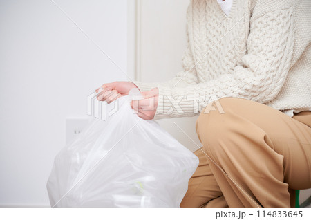キッチンでゴミ箱のゴミをまとめるエプロン姿の女性,主婦