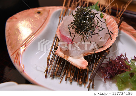 宇和島名物鯛めしの新鮮な真鯛の刺身と豪華な鯛型器の盛り付け