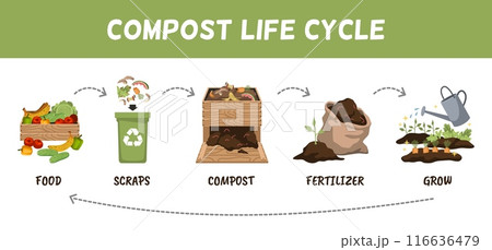 Compost raw materials life circle. Recycling organic waste, fertilizers for garden plants, collect kitchen scraps, vegetables peelings cartoon flat isolated tidy vector infographic poster