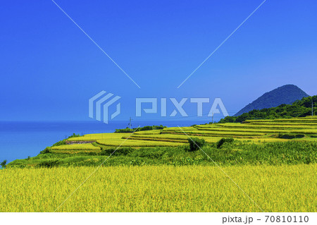 秋の味覚の収穫、田んぼで新米の稲刈りをした稲穂の稲束の写真素材