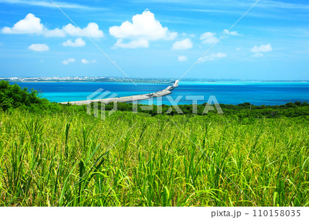 沖縄 伊良部島 さとうきび畑越しに見える伊良部大橋