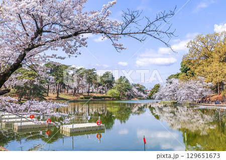 満開の桜の水鏡を見る大宮公園舟遊池