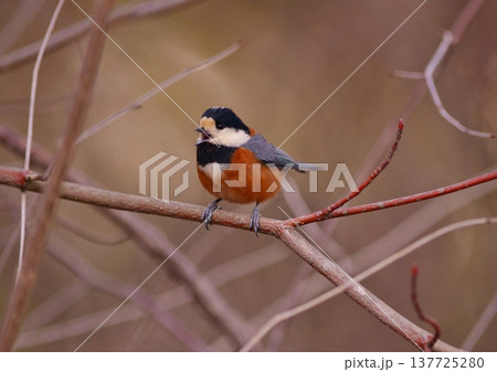 青空を背景に枝にとまるヤマガラ さえずる野鳥