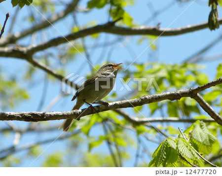 春に日本の雑木林や高原の森に渡来する小さな緑色の小鳥、センダイムシクイ