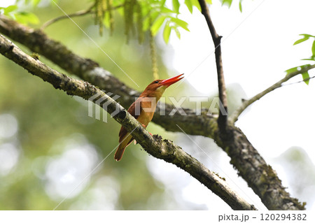 樹木の枝にとまり斜め上を向く夏鳥のキビタキ