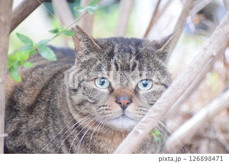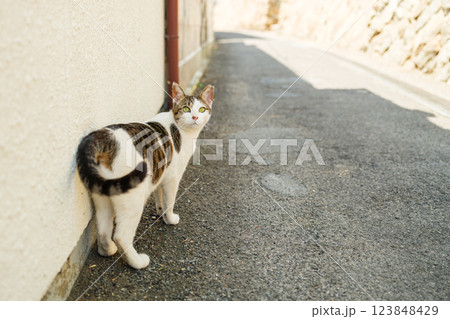 サビ猫の野良猫でボス猫 警戒の目を向ける 遠景