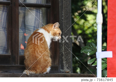 茶白の野良猫 窓の外のカウンタ~に座っている。静寂。