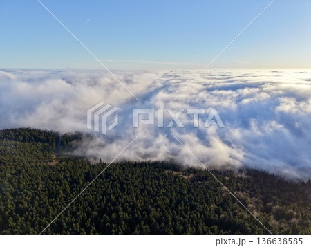 Aerial Perspective Of Misty Mountain Range, Vast Sky With Clouds Flowing Above Wooded Valley At Dawn