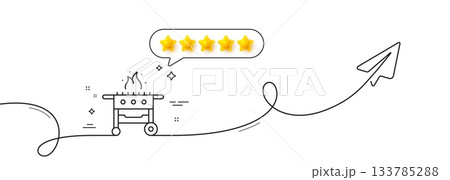 Gas grill line icon. Continuous line with share plane. Barbecue cooker for cooking food sign. Meat brazier symbol. Five star rate review in speech bubble. Gas grill single line ribbon. Vector