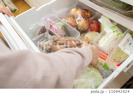 冷蔵庫の野菜室から使いかけの大根を取り出す女性