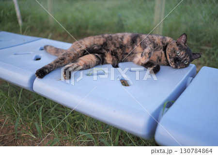 さび猫の背中 1匹の猫が向こうを向いて座っている素材写真