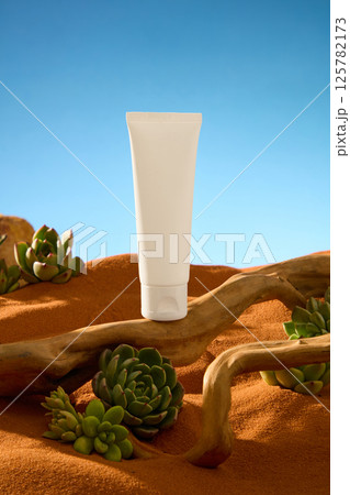 Vertical photo of a cosmetic tube placed on a curved tree trunk. The succulent has many petals like a flower with the roots reaching deep into the dry sand. The undulating sandbank forms sand dunes.