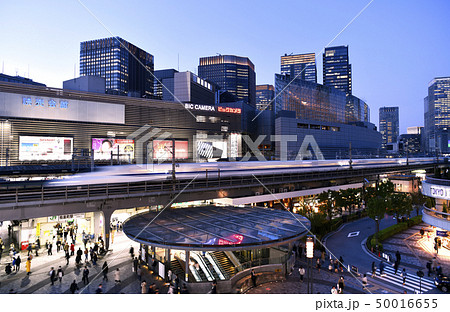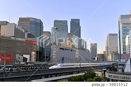 日本の東京都市景観 有楽町駅前を駆け抜ける新幹線