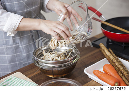 ささがきゴボウの水気を切る女性