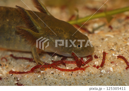 Closeup on gilled larvae of the American Barred tiger salamander, Ambystoma mavortium feeding on bloodworms