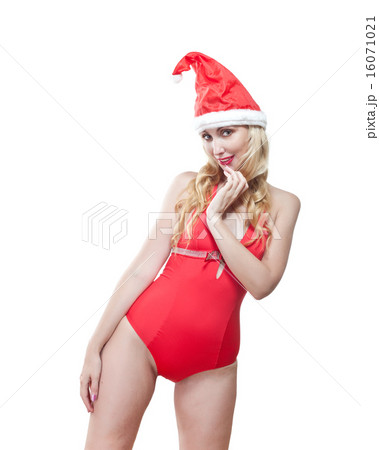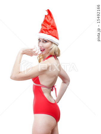 woman in a red bathing suit and a red cap of Santa