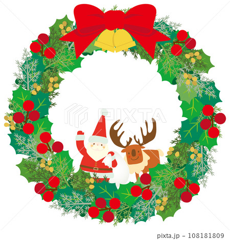 クリスマスリースの中からサンタクロースとトナカイがのぞくかわいいベクターイラスト