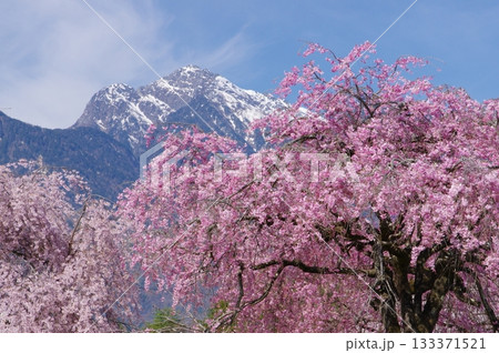 北杜市・眞原の枝垂れ桜と残雪の甲斐駒ヶ岳