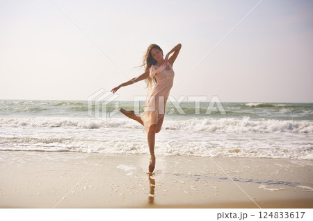 Ballet dancer performs elegant pose on beach. Flowing dress with ocean backdrop