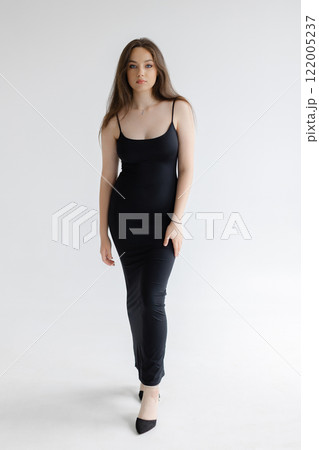 Fashion model posing in long black dress on white background