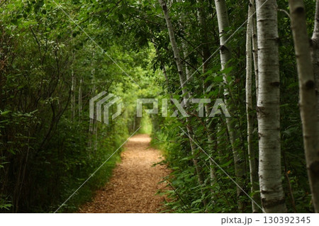 Green forest path with birch trees
