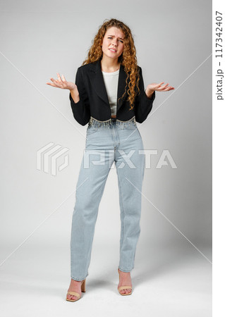 Young Curly Clueless Woman Holding Out Hands