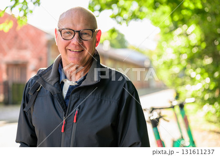 Portrait of a smiling senior man with a electric kick scooter in city