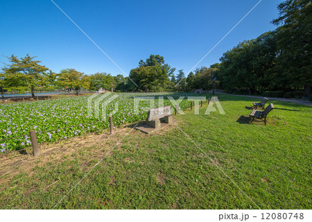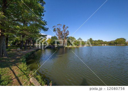 ウォーキングする人がいるしのぶ池の風景/行田水城公園(埼玉県行田市)